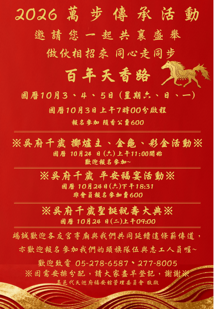 03 2026/10 嘉邑代天巡府福安舘 國曆10月3.4.5日舉行百年天香路 三天兩夜徒步南鯤鯓 活動消息 🏮 2026丙午年【諸羅王爺祭】🏮 一年一度的王爺盛事 你們準備好了嗎?📌國曆10月3日、4日 、 5日,百年天香路,三天兩夜徒步走回南鯤鯓代天府!歡迎眾善信大德踴躍報名電話 :05-278 6587嘉邑福安舘管理委員會敬啟